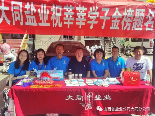 活动现场,大同盐业的职工们身着统一的蓝色短袖,为在考场外殷切等待的家长搭起遮阳凉棚,准备好凳子、矿泉水、团扇、防暑药等物品,以便家长们休息使用,用实实在在的行动为当地考生加油助力。